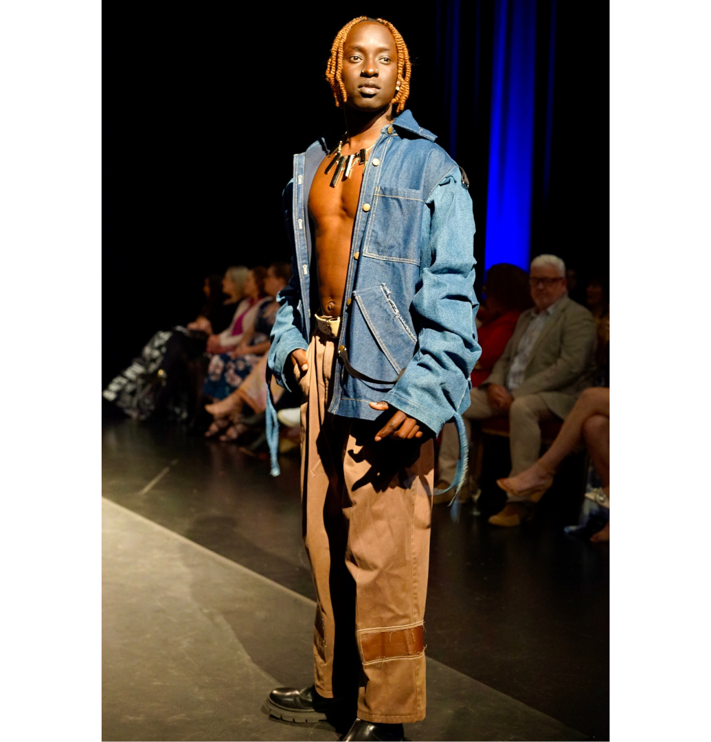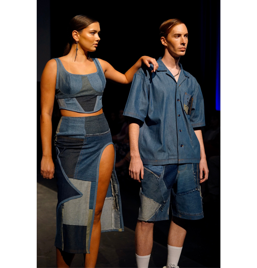Suddenly, they paused to strike a pose—Sophie rested her arm on Jarrod’s shoulder, showcasing the intricate patchwork denim detailing of her Khashaee-designed skirt, and revealing an ultra-high, irresistibly sexy split. She was the epitome of denim chic from denim shoes to matching accessories. Meanwhile, her partner in crime on the runway, Jarrod Montoro, gazed out across the entirety of the Armitage Centre at The Empire Theatre. If looks could kill, Jarrod would undoubtedly top the hit list.